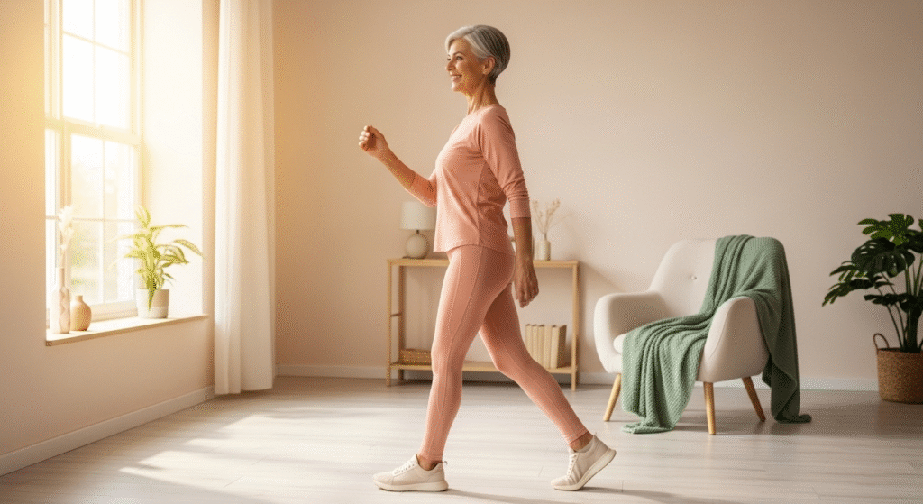 Minutes 3-8 (Power Phase): Walk in a square pattern (or back and forth if space is limited). Every 90 seconds, add these core-activating movements: gentle torso twists while walking (works obliques and reduces love handles), knee lifts with opposite elbow touches (engages entire core), and side steps with reaching arms (sculpts waistline). Maintain constant core engagement—navel to spine.