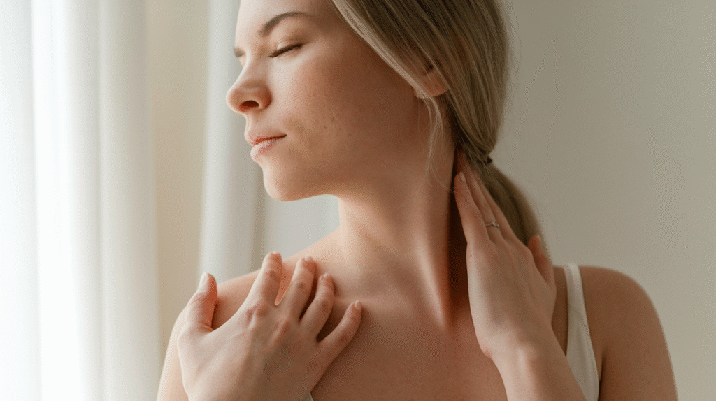 This targets that stubborn muscle that runs from behind your ear down to your shoulder blade—the one that causes that sharp pain when you turn your head. Turn your head 45 degrees to the right, then drop your chin toward your armpit. Place your right hand on the back of your head and apply gentle pressure. You should feel a deep stretch along the back left side of your neck. Hold for 30 seconds, breathing steadily. Switch sides. This “look and drop” technique effectively releases one of the most common sources of neck pain.