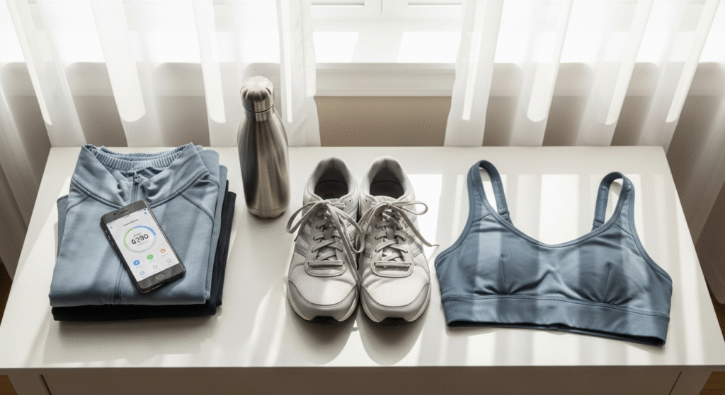 Comfortable, moisture-wicking clothing means anything you can move in freely. You don’t need special athletic wear—cotton t-shirts and leggings work fine. If you walk in humid conditions, moisture-wicking fabric prevents chafing. A supportive sports bra matters for comfort, not performance.