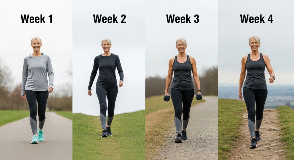 Days 4-7 increase to 20-25 minutes. Introduce slight pace variations: walk your normal pace for 3 minutes, then slightly faster for 1 minute, then back to normal. This isn’t intense—just enough variation to keep your body responsive.