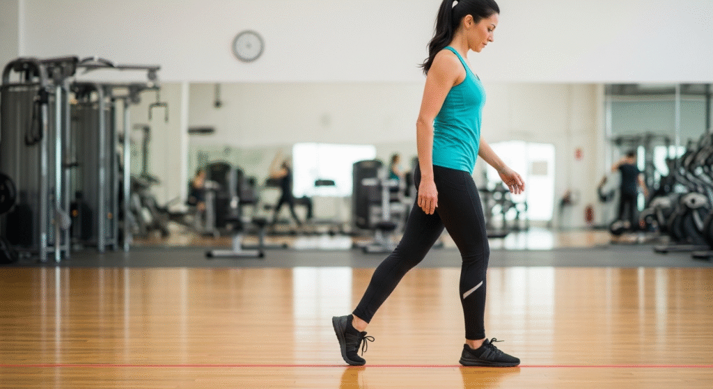 While single-leg stance builds static balance, heel-to-toe walking improves dynamic balance—balance while moving. This distinction is crucial because most falls happen when you’re in motion, not standing still. This exercise enhances coordination and spatial awareness while strengthening your ankles and improving your gait pattern.