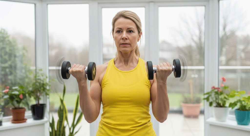 Choose a weight that feels challenging by rep 10 but allows you to complete all reps with perfect form. For most women over 40 starting out, this means 5-8 pound dumbbells. Don’t let ego choose your weights—proper form builds strength, not heavy weights with terrible technique.