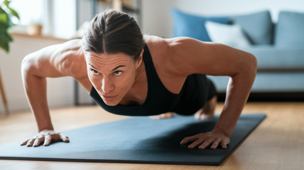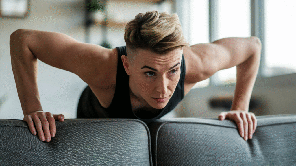 Push-Up Variations – Start with incline push-ups using your couch if standard push-ups feel too challenging. As you build strength, progress to standard push-ups on the floor, then elevate your feet on the couch for decline push-ups. Each variation shifts the emphasis and increases difficulty. Aim for 3 sets of 10-15 reps, resting 45-60 seconds between sets.