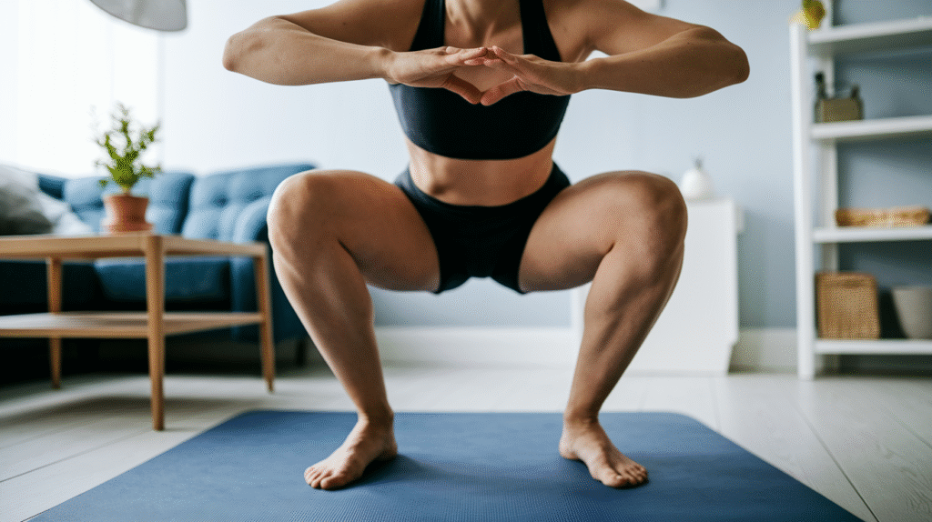 Squats – The foundation of lower body strength. Start with bodyweight squats, focusing on sitting back like you’re lowering into a chair. Progress to single-leg squats (holding a wall for balance) or pulse squats that keep tension constant. Aim for 3 sets of 15-20 reps.