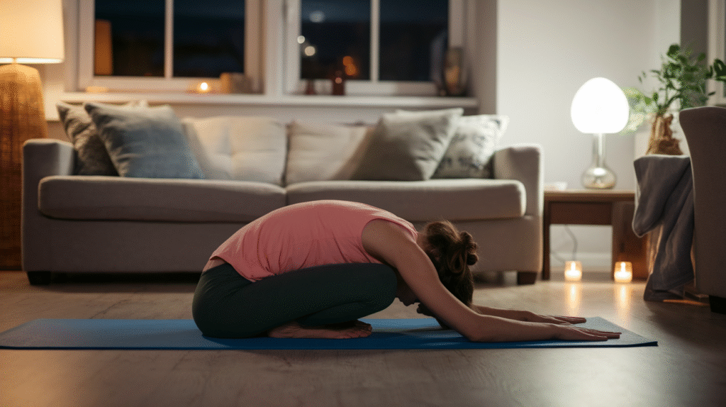 Restorative Poses – Use couch cushions or pillows as props for supported child’s pose or legs-up-the-wall pose. These restorative positions activate your parasympathetic nervous system, signaling your body that it’s safe to rest and recover.