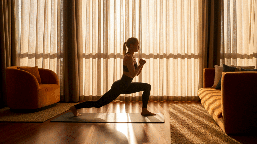 What you actually need fits in a small corner: a yoga mat or large towel for cushioning, comfortable clothes you can move in (pajamas work fine!), and a water bottle to stay hydrated. That’s it. No expensive equipment, no special gear, no complicated setup.