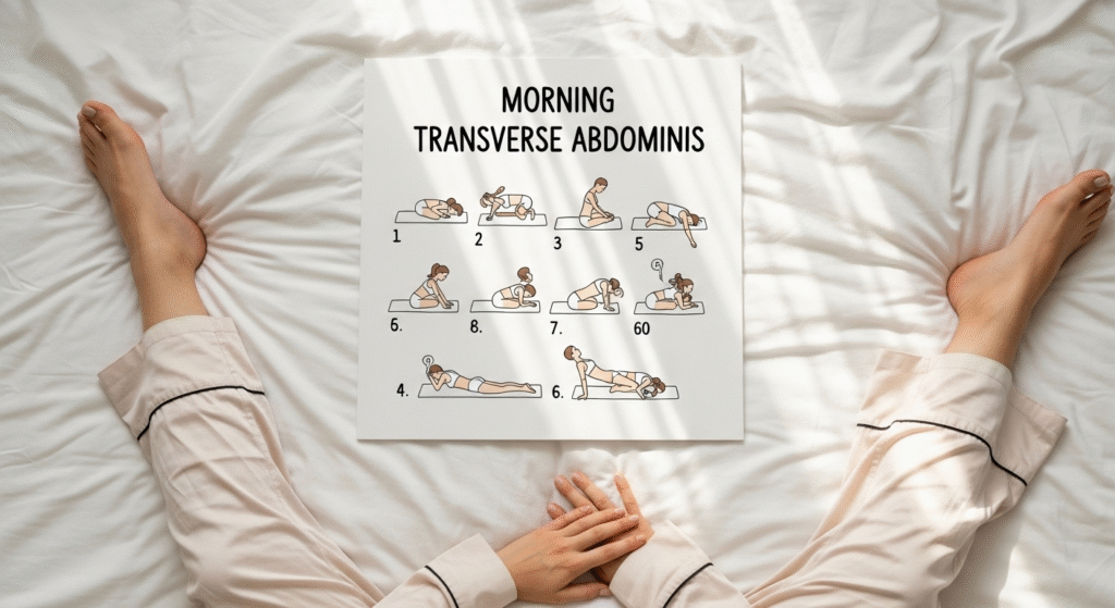 The extraordinary thing about transverse abdominis exercises is that the most effective ones do not require you to be upright, on the floor or even dressed. They can be done lying exactly where you are right now — in bed, before you get up — in under fifteen minutes.